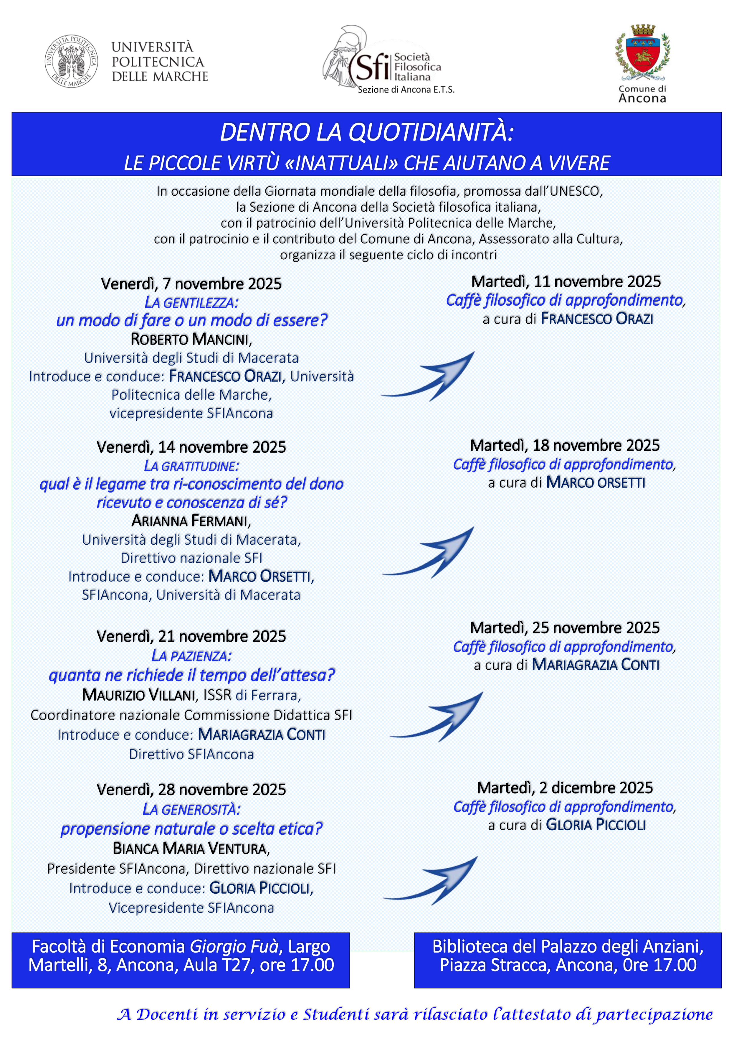 Il calendario degli eventi della città si arricchisce nel mese di Novembre grazie al ciclo di incontri, sostenuti dall'Assessorato alla Cultura attraverso il bando 2025, dal titolo "Dentro la quotidianità: le piccole virtù "inattuali" che aiutano a vivere": proposti dalla Sezione di Ancona della Società Filosofica Italiana, con il patrocinio e la collaborazione dell'Università Politecnica delle Marche, questi eventi creano un ambiente di confronto tra filosofi, docenti e appassionati, permettendo lo scambio di idee e prospettive diverse. La partecipazione a questi incontri offre un'opportunità di crescita intellettuale, consentendo di sviluppare il senso critico e di maturare nuove e inaspettate riflessioni come solo la filosofia riesce a generare. Ci tengo a evidenziare che gli incontri si terranno presso la sede di Economia dell'Università mentre i Caffè filosofici saranno ospitati nella sala Conferenze di Palazzo degli Anziani attuale sede della biblioteca Benincasa: due sedi importanti che possono favorire la contaminazione tra generazioni e pubblici diversi.